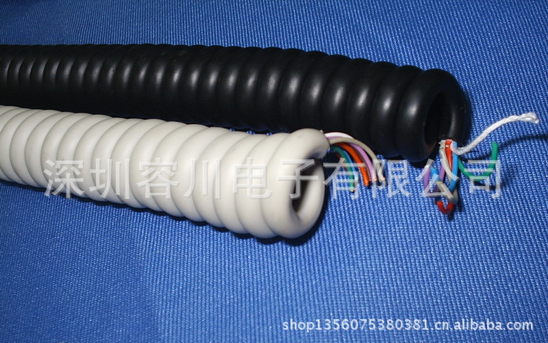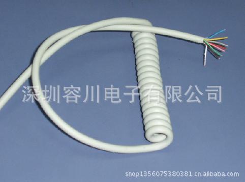 弹簧线又称弹弓线和螺旋线,是一种利用可伸缩性来工作的设备连接线。一般用TPU电缆绕制而成。用以控制可移动设备运动的电源连接,可在短时间内迅速回弹,广泛用于汽车、机器、仪表等可移动设备中。按方向分,主要有左方向螺旋弹簧和右方向螺旋弹簧。 按材质分:主要有TPU弹簧线、PVC弹簧线;TPU弹簧线具有阻燃,耐油,耐酸碱,耐低温,防紫外线,耐磨,抗水解等特效,PU料作为弹簧线的首选材料越来越广泛的被运用。其主要运用有: ①控制系统用TPU/PVC护套(屏蔽)弹簧线:应用于数控机床,生产线,物流系统,机器人等; ②动力系统用TPU/PVC护套(屏蔽)弹簧线:应用于加工设备,起重机,生产线等; ③数据/总线传输用TPU/PVC护套(屏蔽)弹簧线:应用于数控机床,生产线,物流系统,机器人等。弹簧线各部分名称及尺寸关系: (1)弹簧丝直径d:制造弹簧线的铜丝直径; (2)弹簧线圈径D:弹簧线的圈外径; (3)弹簧线内圈径D1:弹簧线的圈内径; (4)弹簧线螺旋长度L:弹簧线在未受外力的作用下的静态长度; (5)弹簧线工作长度L0:弹簧线在受外力坐下下的动态长度; (6)弹簧线展开长度A:绕制弹簧线所需直线的总长度; (7)弹簧线留尾长度:两头留尾分别用L1和L2表示; (8)螺旋方向:有左右旋之分,常用右旋,图纸没注明的一般用右旋。