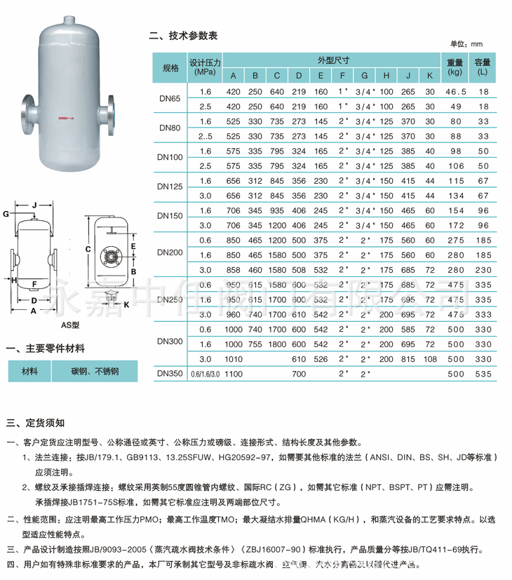 永嘉专业汽水分离器AS型桶式汽水分离器不锈钢桶式分离器过滤器