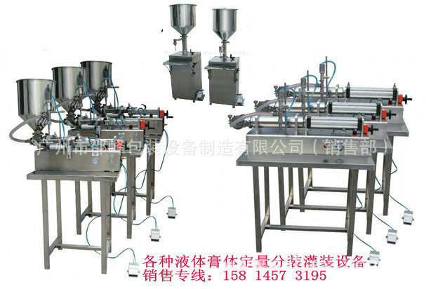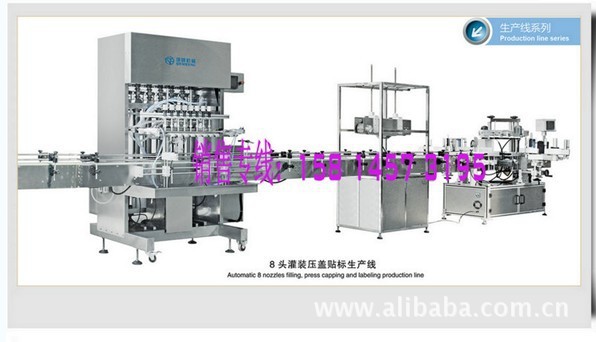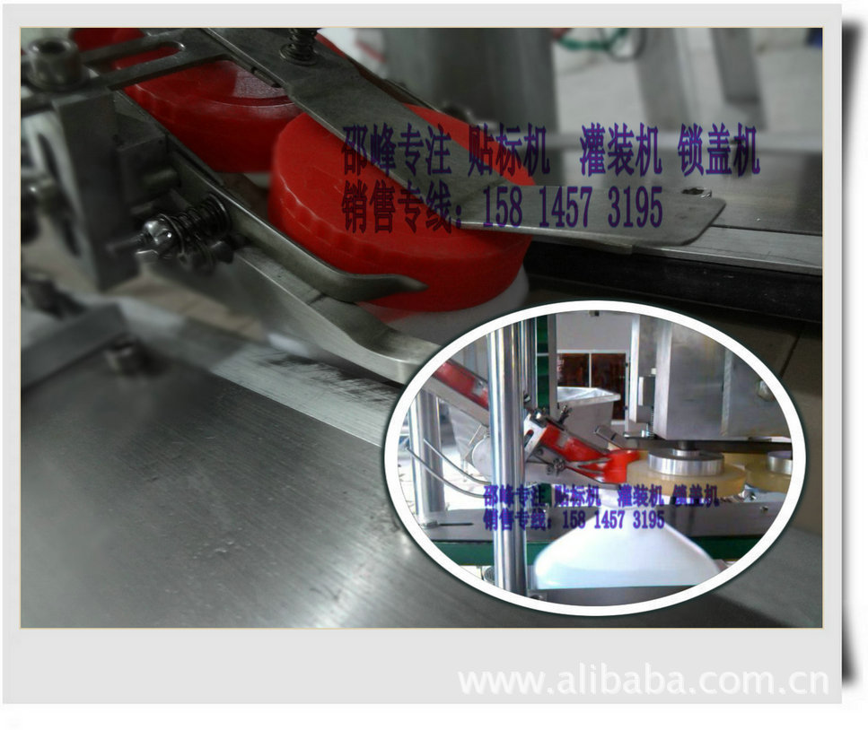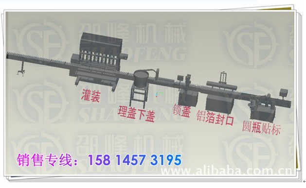 工作流程为:人工送空瓶---电眼检测自动拦截瓶---灌装嘴下降---定量分装灌装(可上升分段逐步灌装)---自动理盖装盖---锁盖(扭盖或压盖)---自动铝箔封口----进入装箱工位、(可选配喷码机-贴标机)