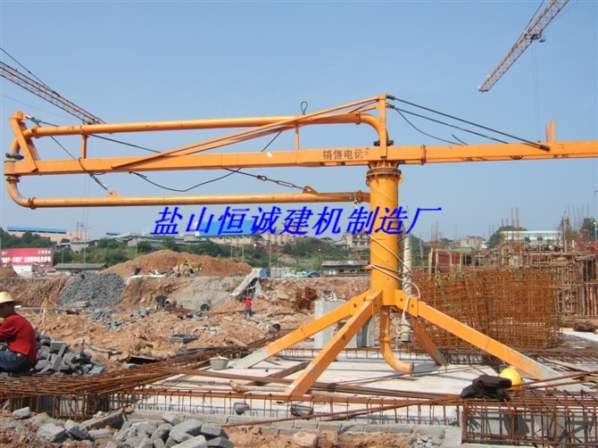 河 北省盐山县恒诚建机制造厂是生产各类国产进口混凝土拖式泵、泵车管道配件的专业厂家 主要产品:混凝土双轴承手动布料机、布料杆:BLG-12米、15米、18米系列产品。其特点造型美观,布料范围广,结构合理,上主梁采用拼装式结构,便 于运输及工地转移,中间回转采用标准滚动回转支撑,弯管半径设计合理,泵送阻力小,支撑节高度,可根据用户需要增减,底角配有四条支腿,。本产品在原来三 角臂,四角臂布料机前提下,更改为现在双槽钢对焊结构产品,产品更为安全、可靠、实用。本机械手动操作轻便灵活,全回转360度,能将混凝土快速准确的送 低施工作业面的任一浇拄部位,并连续浇注。极大地解决了混凝土水平面布料问题。混凝土布料机、布料杆与混凝土泵有效地连接配套,使两种机械性能得到了最大 发挥真正提高了混凝土浇注质量,达到了机械化水平