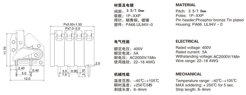 间距:3.5/7.0mm;极数:1P-xxP;额定电压/电流:400V/5A