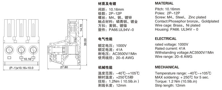 间距:10.16mm;极数:2P-12P;额定电压/电流:1000V/41A