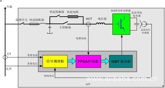 如图2-2所示,隔离开关合闸后,为防止上电后电网对直流母线电容器的瞬间冲击,APF首先通过软起电阻对直流母线的电容器充电,这个过程会持续几十秒。当母线电压Udc达到预定值后,主接触器闭合。直流电容作为储能器件,通过IGBT逆变器和内部电抗器向外输出补偿电流提供能量。APF通过外部CT实时采集电流信号送至信号调理电路,然后再送至FPGA控制器。绍兴杰棱电力控制器将基波成分分离,提取出所有的谐波,将采集到的谐波成分和APF已发出的补偿电流比较得到差值作为实时补偿信号输出到驱动电路,触发IGBT变换器将补偿谐波电流注入到电网中,实现滤除谐波的功能。
