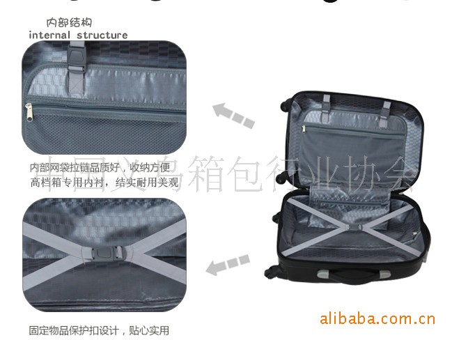 【内部结构】:内部选用高档丝质衬布,网袋设计,分隔箱内空间,使物品更容易归类,一条X型弹性丝带,固定定物品,为您宝贵的旅行物品提供全方位保护。