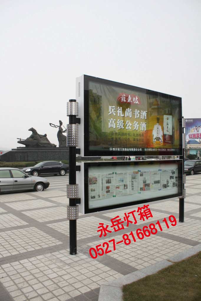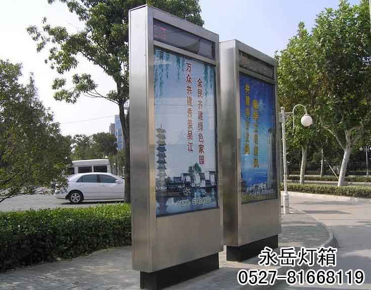 江苏宿迁永岳广告制品厂专业研发、制作和销售滚动灯箱,滚动广告灯箱,换画灯箱,不锈钢滚动灯箱,广告滚动灯箱,换画广告灯箱,智能双面滚动灯箱,超薄灯箱,LED滚动灯箱,候车亭滚动灯箱,阅报栏滚动灯箱,路滚动灯箱,展示展览器材,银行ATM机防护罩,多画面广告擦鞋机,滚动灯箱配件,换画灯箱配件,广告灯箱套件机芯,各种广告灯箱等。