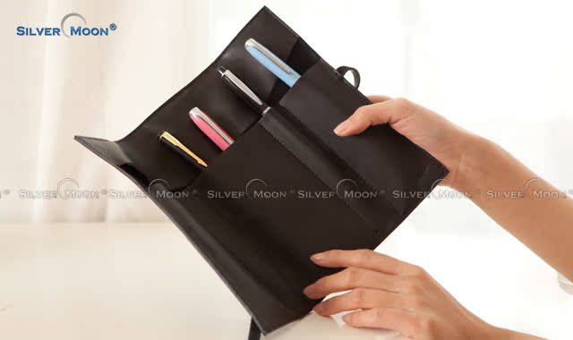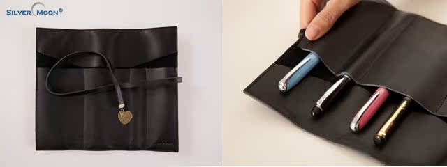 精选高档真皮材质,手感柔软舒适; 精心设计四种大小不同口袋,可容纳多款各种尺寸的笔。