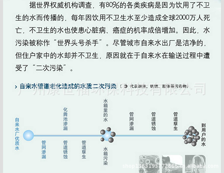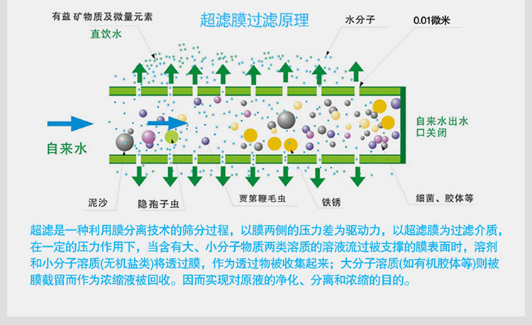 通水量:1000升/小时 1:高精度纯物理过滤,净化水可直接饮用 超滤膜分离新技术,高精度纯物理过滤,过滤精度达到0.01微米,有效滤除水中泥沙,细菌,胶体,铁锈,悬浮物,藻类,大分子有机物等有害物质,同时保留人体有益的微量元素和矿物质,净化水可直接饮用。 2:自动冲洗结构,易排污 高效冲洗排污结构,有效冲洗超滤膜截留的污染物,防止滤芯堵塞,保证净化水流量,延长滤芯使用寿命。 3:无需用电加压,安全节能 无需用电加压,依靠自来水本身压力即可过滤,净化过程中无废水产生,安全节能。 4:自动排污,不脏堵 一体化的结构设计,无过滤死区,自动排污,不脏堵,滤芯饱和后,自动断水,换芯方便,使用寿命达三年。 5:豪华耐用 不锈钢外壳,豪华耐用。 过滤工艺:中空纤维超滤膜