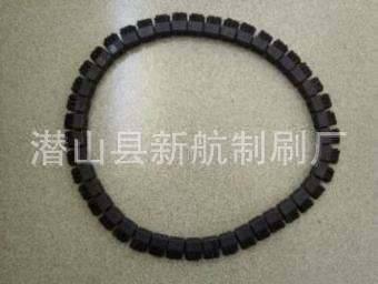 皮带刷的特性目前国内的皮带刷因为是手工制成,背面难免会露出串丝用的尼龙线,不过不用担心串丝用的尼龙线会断掉,通常这种串丝用的尼龙线品质近似于钓鱼线,非常的有韧性,耐磨性。皮带的种类有长条状及圆环状两种,成色有灰色的,红色的,绿色的等,宽度根据不同设备而定。皮带刷上的毛长也是可控的,用于不同设备制作时可设定它的长短。皮带刷的制作方式首先在皮带上冲孔后,再将刷丝对折用尼龙线穿在皮带上,再修剪刷毛。 因皮带的软体性,它的制作工艺看似简单,可制作时确很是麻烦,特别是植毛阶段,都是经验丰富的员工单独完成,目前国内还没先进的设备进行量产,一般的机械根本无法操作。首先在皮带上冲孔后,再将刷丝对折用尼龙线穿在皮带上,再修剪刷毛。