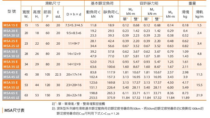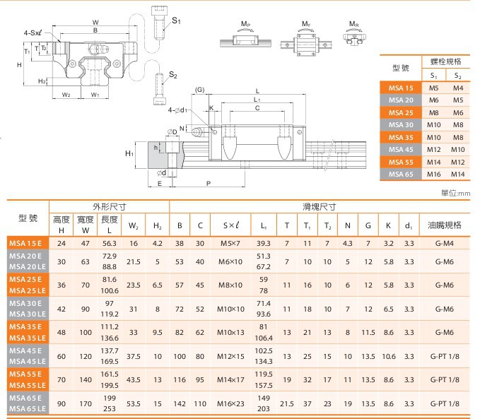 MSA型是高组装滑座型式;E:有法兰螺纹型滑块;LE:有法兰螺纹加长型滑块;S:方型螺纹型滑块;LS:方型螺纹加长型滑块。