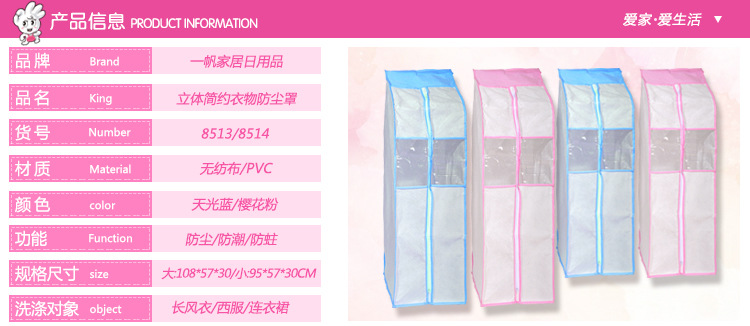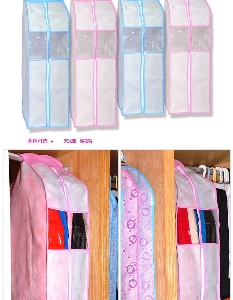 本产品具有防尘、防霉、防虫的功能,是服装保护的理想佳品。高档衣物、正装、大衣不宜折叠,悬挂在衣橱内又易沾染灰尘,本品为专供大中城市超市上柜的高档三防(防尘,防蛀,防潮)衣物收纳罩,设计有透明可视窗,每件装有哪件衣物一目了然,全包边精细做工,于细微处凸显您的不凡品味!