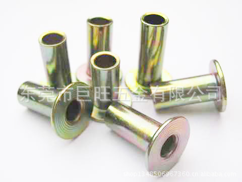 空心铆钉需要再次铆接,用于重工件联结,常为不可拆结构,空心铆钉应用最为广泛,束口(线径尾部较小)钉使用硬质线材制造,能不需预孔穿透0.5mm厚度内的钢板,空心铆钉不能弯曲变形,广泛应用在密码箱,旅行箱和军用箱包上面,中空钉(半空心铆钉)则使用软线制造,一般要求铆开后不能开裂,有很多种类型,目前对一些玩具上面的轴已经开始大面积使用空心铆钉或子母钉替代,能大幅降低生产成本。抽芯和击芯铆钉则多用于较为薄软材料的铆接,一般要求不严格,制造用材通常用塑性较好的材料生产。