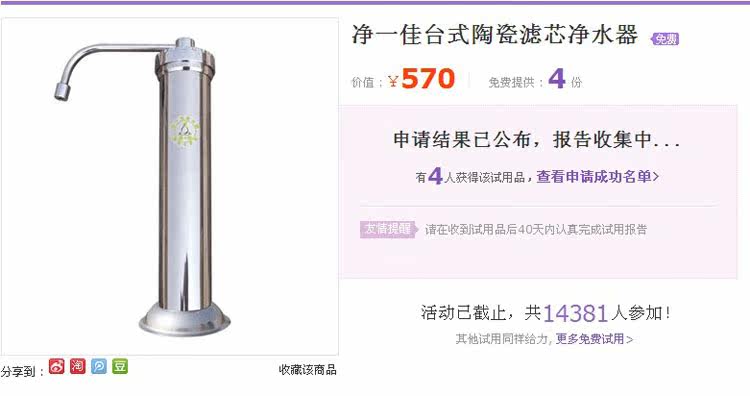 喜讯!净一佳已经圆满结束了淘宝免费试用活动,0元免费包邮赠送4台净一佳台式直饮净水器。截止22日零点,有14381名买家申请。再次恭喜4位成功试用的亲们!