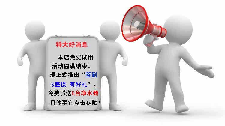 由于参加本次试用的宝贝数量有限,对于没成功申请的亲们,不用担心,现在有“签到&盖楼,有好礼”--免费送5台净一佳龙头净水器活动,来报答亲们的支持!具体事宜点击上图!