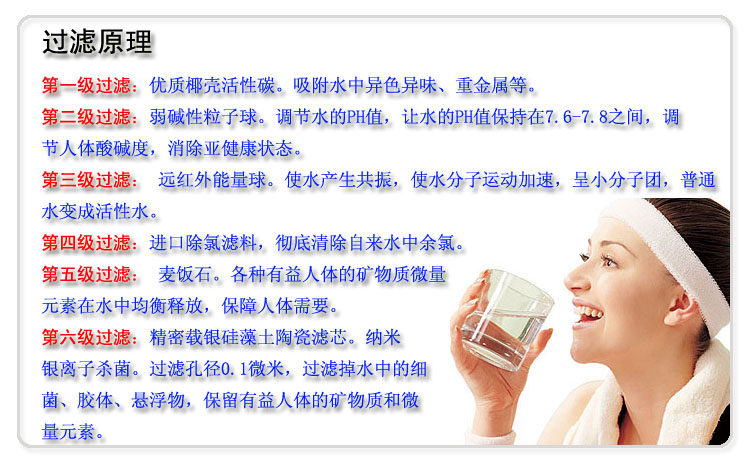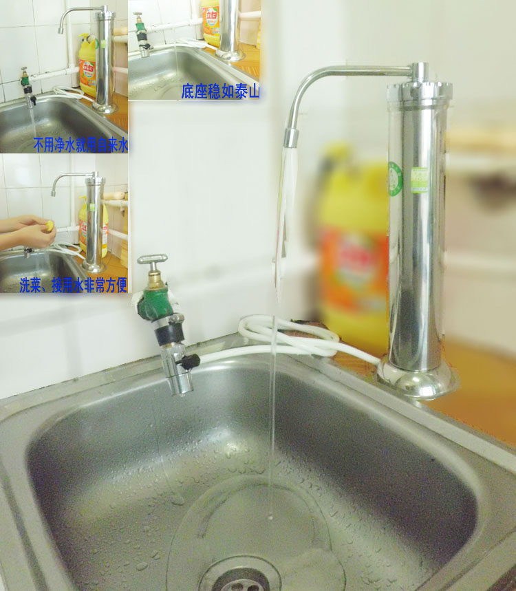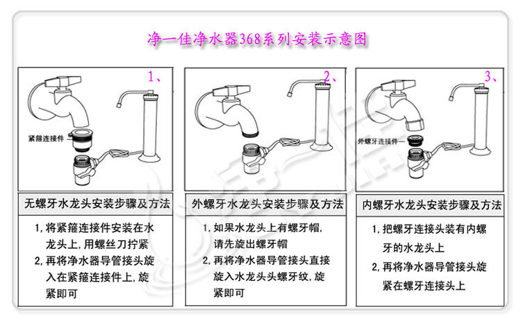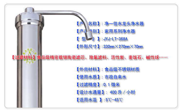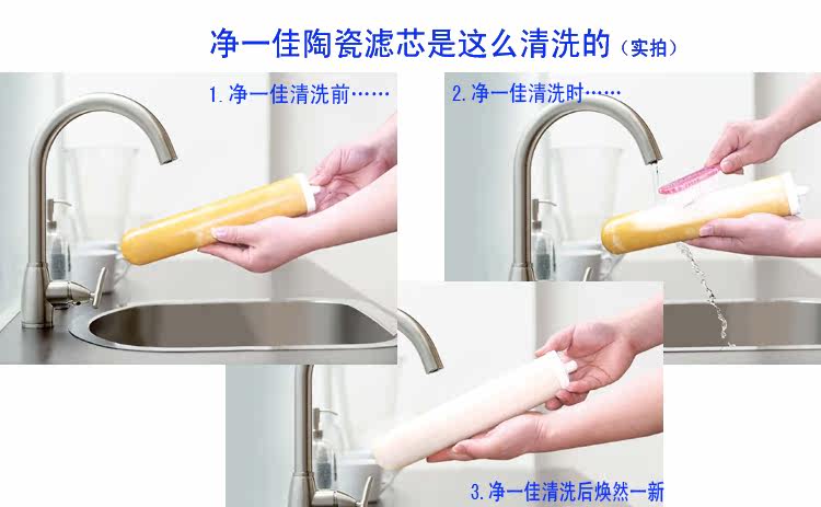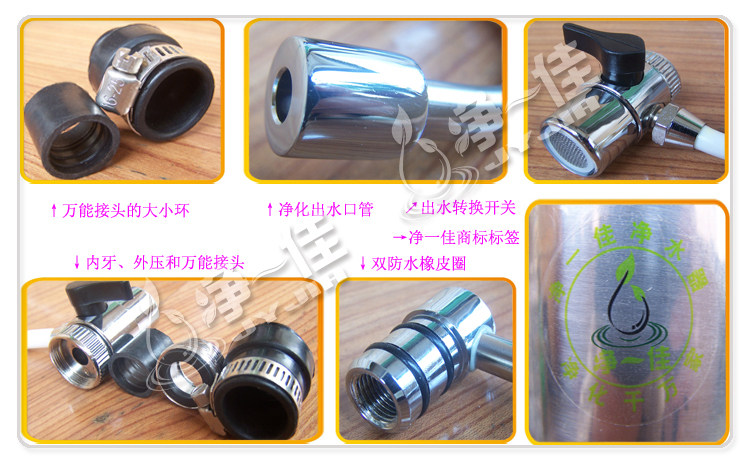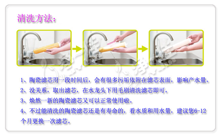 安装注意:安装时,请先撕开滤芯包装,将滤芯旋入出水嘴内螺纹中,旋紧即可,然后旋紧不锈钢滤筒,注意小心碰撞。