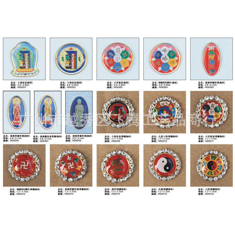 【品名】带钻胸针 【编号】HDK系列 【规格】1.7*1.7cm 【材料】铜材 【特点】胸针是我司今年新研发的产品,经过二十多道工序完成,用上海65黄铜制作而成,小小的胸针可以别在衣服上,既可以装饰又可以保你平安吉祥 |