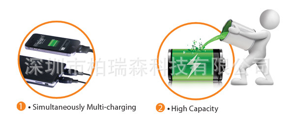 2、兼容性强、性价比高:可随时随地为市场各种品牌的手机、MP3、MP4等多种便携式数码产品可同时充iPhone iPad. 供电或充电,一机多用,省钱省时。