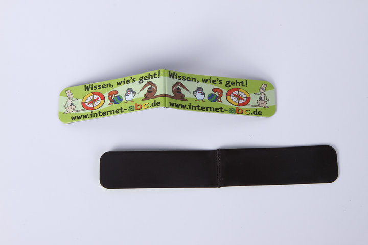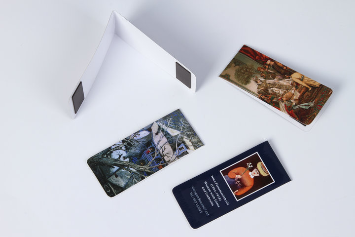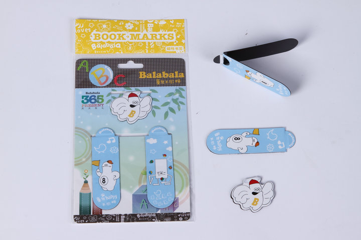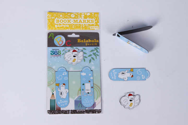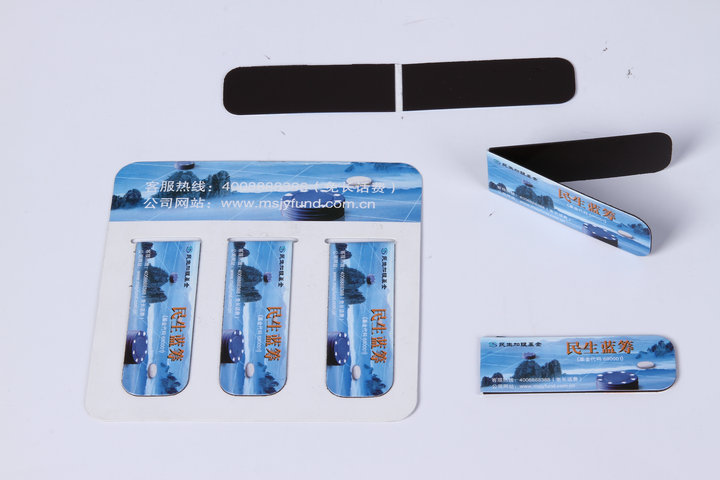 3)磁性书签:采用下面软胶磁铁(对吸磁)+上面铜版纸四色印刷腹膜对折制作而成。