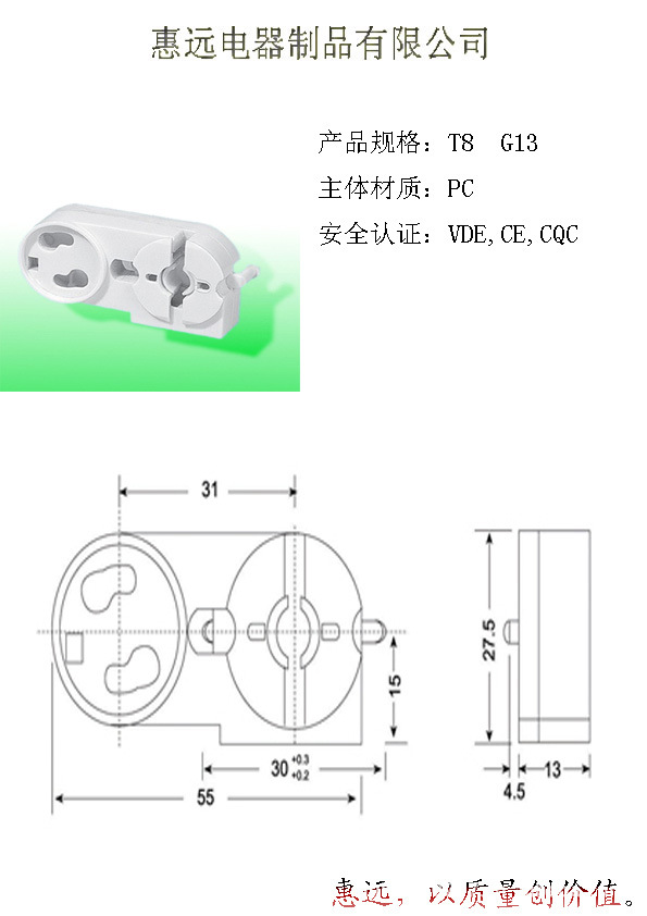 《惠远电器制品有限公司》是电子电器开关、灯头灯座、接线端子台和插头插座的专业制造商。自2002年于广东佛山成立制造配件事业部以来,公司始终坚持立诚信、重质量、共发展的理念发展事业。不断创新,并于10年后的2012年,与《佛山市展远电子有限公司》携手合并,共创新的辉煌。
