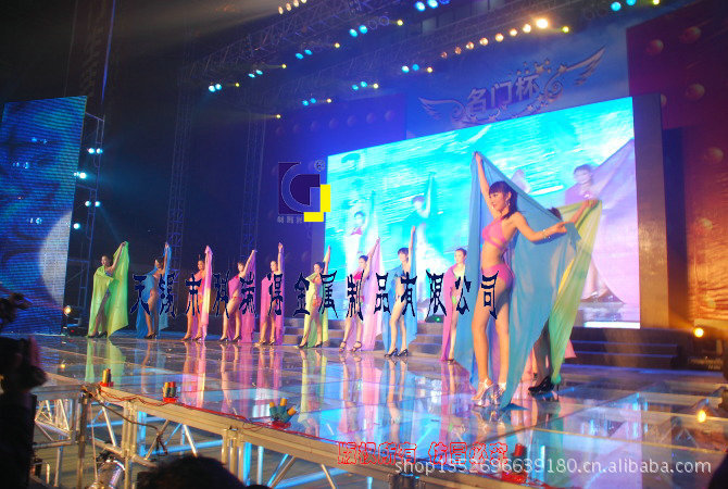 铝合金玻璃舞台是一款比较常用的活动舞台,是目前国内外市场比较畅销的舞台。采用拆装式设计,外形美观、搭建方便、可调节高度、稳定性强。为演出增添了效果。现场安装及拆卸方便,提高安装的作业效率,舞台性能安全且耐用。舞台采用长1.22M宽1.22M长,高度有4种调节范围,可任意单元拼接结构,适用于不同的地势环境。铝合金玻璃舞台,由支架,立柱,可调节底座,玻璃组合而成。每张舞台和相邻的舞台的立柱和支架是共用的,所以连接好后是一个整体非常牢固。拆装和安装方便,其舞台面是由胶片或钢化玻璃以及多层夹板与铝框构成,其具有较好的防火阻燃、耐磨损、无伤害、装饰性强等特点,舞台框采用高硬度铝合金材料,结构牢固,外观漂亮。同时配备舞台楼梯台阶,可以任意活动搁放在舞台的任何地方,以方便演出时表演者上下台,整体效果完美,质量保证,亦可定做规格尺寸。