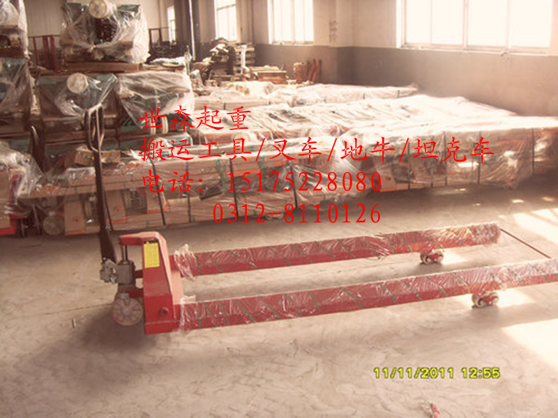 a.手把安装好后,将搬运车放在平坦的水泥地上掀动手柄将货叉升至最高位,随后拉动控制拉手,能手控货叉平稳下降至最低位置
