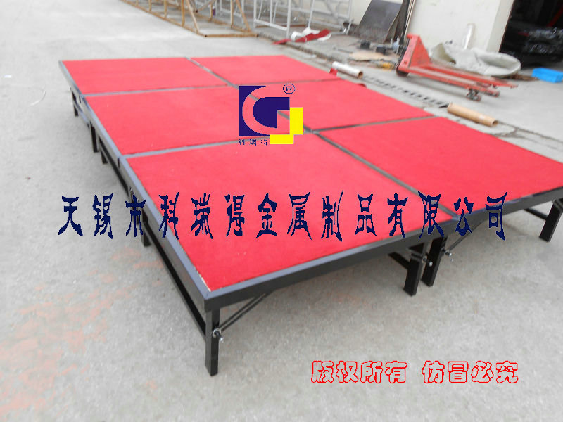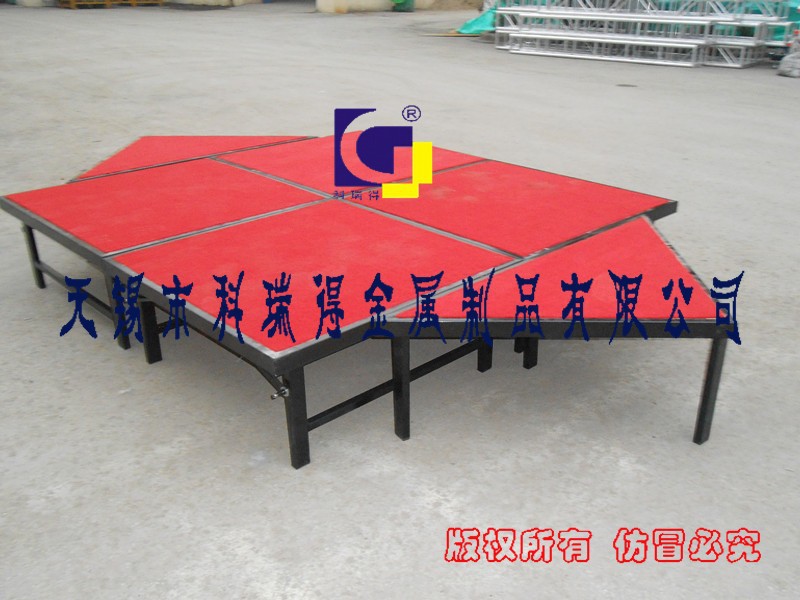 常规舞台尺寸:1.22m*1.22m方形,舞台板采用18mm厚建筑胶合板,两面防水。表面铺5mm厚高档纤维红色地毯,角铁包边。