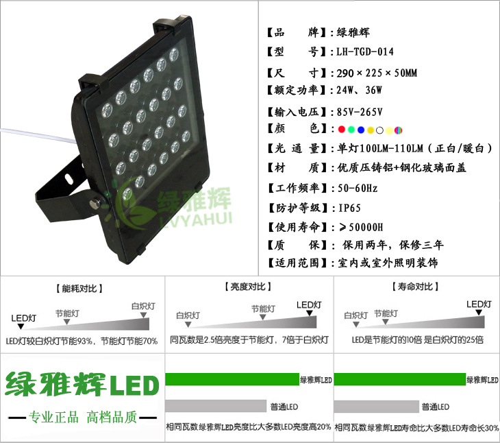 1、LED投光灯采用高亮度进口芯片,亮度高,低能耗,低热量,寿命长达到 50000H,可分为单色,七彩变色两种。 2、外壳采用高级氧化喷涂铝型材和整体模压加工工艺,钢化玻璃面盖,确保了良好的散热效果,有效的减少了LED使用过程中的光衰。 3、采光光学级PMMA高效透镜,光损小、照度好。 4、采用滚边等新工艺,确保外壳整体性好,密封可靠,防水防尘达IP65。 5、使用电压12V、24V、85V-265V可选。 6、投射距离达10-20米以上,特别适合景观建筑物楼体,户外广场,墙面、陈列品刷色 。 7、具有良好的电磁兼容性,不会对周边环境造成电磁干扰。 8、使用低压电源,安全可靠,耗电少,使用寿命长结实耐用,安装操作程序简单。 9、广泛应用于单体建筑、历史建筑群外墙照明、大楼内光外透照明、室内局部照明、绿化景观照明、广告牌照明、医疗文化等专门设施照明、酒吧、舞厅等娱乐场所气氛照明等。 |