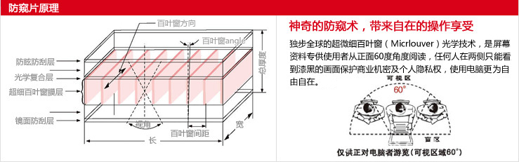 運用高科技光學專利技術—超微細百葉窗(Microlouver)與多層精密貼合技術藉以控制光的反射,讓在螢幕正前方的使用者可以清楚看到畫面,兩側的人只要視角超過60度,則只會看到漆黑畫面。