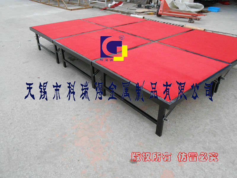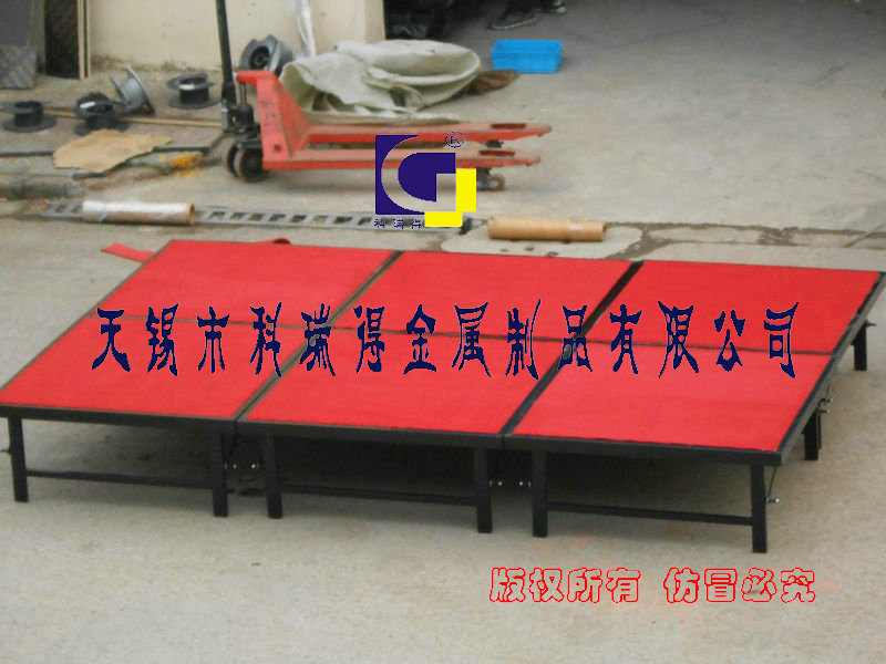 常规舞台尺寸:1.22m*1.22m方形,舞台板采用18mm厚建筑胶合板,两面防水。表面铺5mm厚高档纤维红色地毯,角铁包边。