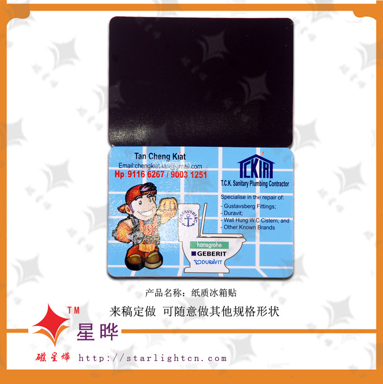 本产品采用磁性材料裱铜版纸彩色印刷腹膜制作而成,色彩丰富,使用寿命长,移动方便,自由组合,避免了粘贴胶质遗留痕迹的问题,可贴于冰箱贴等任何金属平面物体外表。使用范围广,是商务促销的最佳选择。