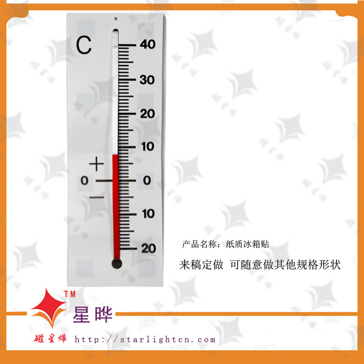 2)温度计冰箱贴:采用下面软胶磁铁+上面铜版纸四色印刷裱光膜+温度计.