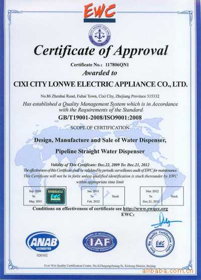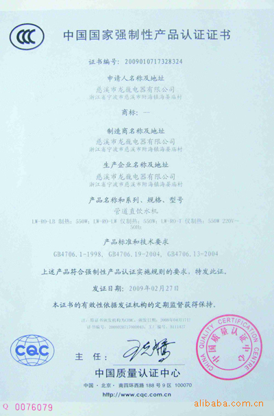 公司先后通过了ISO9001、2000国际质量管理体系认证,行业内首批通过国家3C认证,先后通过国际CB、欧盟CE以及ROHS、soncap等十几个国外权威机构的认证,并获外经贸自营进出口权。多年来,龙巍水家电产品畅销海内外,销售网络遍及全国 20 多个省、市、自治区,设立有600 多家代理商和服务商,客户遍布东南亚、非洲、中东、欧洲、南美等60多个国家和地区,产品品质誉满全球。