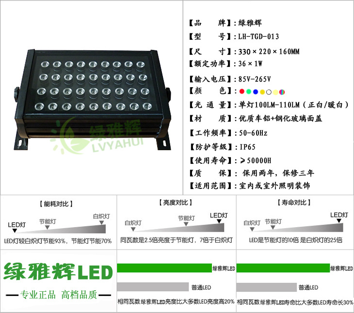 1、LED投光灯采用高亮度进口芯片,亮度高,低能耗,低热量,寿命长达到 50000H,可分为单色,七彩变色两种。 2、外壳采用高级氧化喷涂铝型材和整体模压加工工艺,钢化玻璃面盖,确保了良好的散热效果,有效的减少了LED使用过程中的光衰。 3、采光光学级PMMA高效透镜,光损小、照度好。 4、采用滚边等新工艺,确保外壳整体性好,密封可靠,防水防尘达IP65。 5、使用电压12V、24V、85V-265V可选。 6、投射距离达10-20米以上,特别适合景观建筑物楼体,户外广场,墙面、陈列品刷色 。 7、具有良好的电磁兼容性,不会对周边环境造成电磁干扰。 8、使用低压电源,安全可靠,耗电少,使用寿命长结实耐用,安装操作程序简单。 9、广泛应用于单体建筑、历史建筑群外墙照明、大楼内光外透照明、室内局部照明、绿化景观照明、广告牌照明、医疗文化等专门设施照明、酒吧、舞厅等娱乐场所气氛照明等。 |