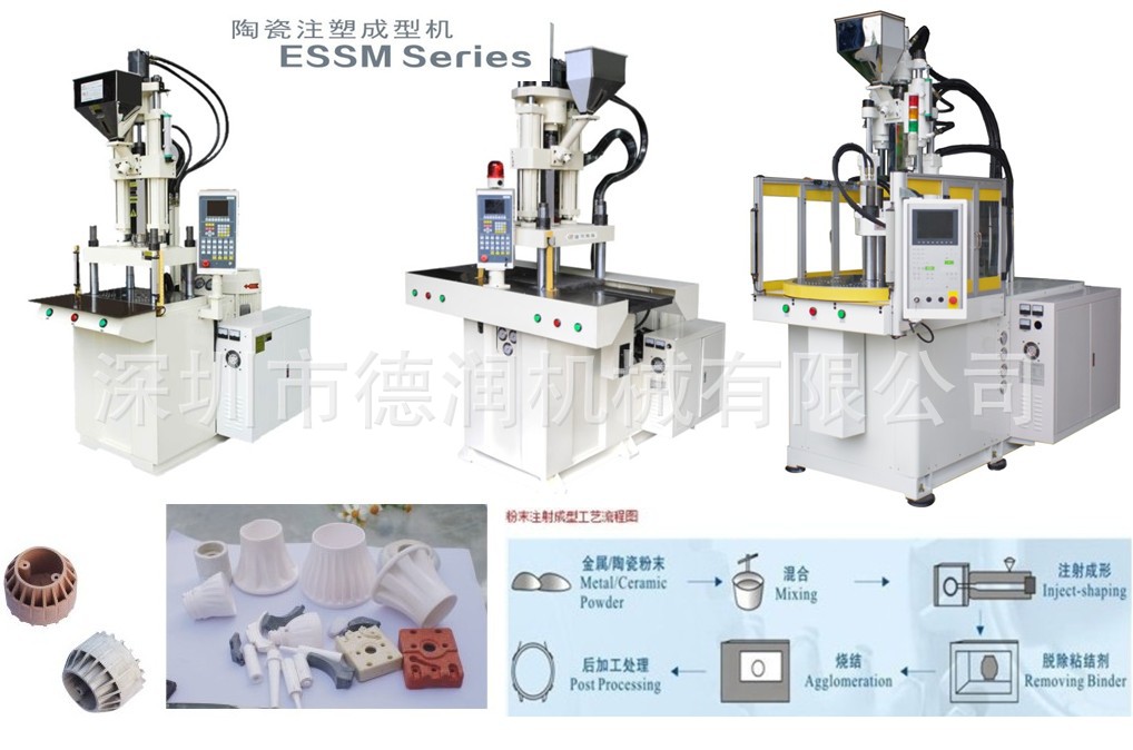 粉末注塑成型机是一种注塑兼模塑的成型方法,又称注射成型,通用注塑方法是奖聚合物组分的粒料放入到注塑机的料筒内,经过加热、压缩、剪切、混合和输送作用。使物料进行均化和熔融,这一过程又称为塑化。然后再借助于螺杆向熔化好的聚合物熔体施加压力,则高温熔体便通过料筒前面的喷嘴和模具的浇道系统射入预先闭合的低温模腔中,再经冷却定型就可开启模具,顶出制品,得到具有一定几何形状和精度的粉末制品,再经过高温脱腊、烧结就得了到理想的制品。