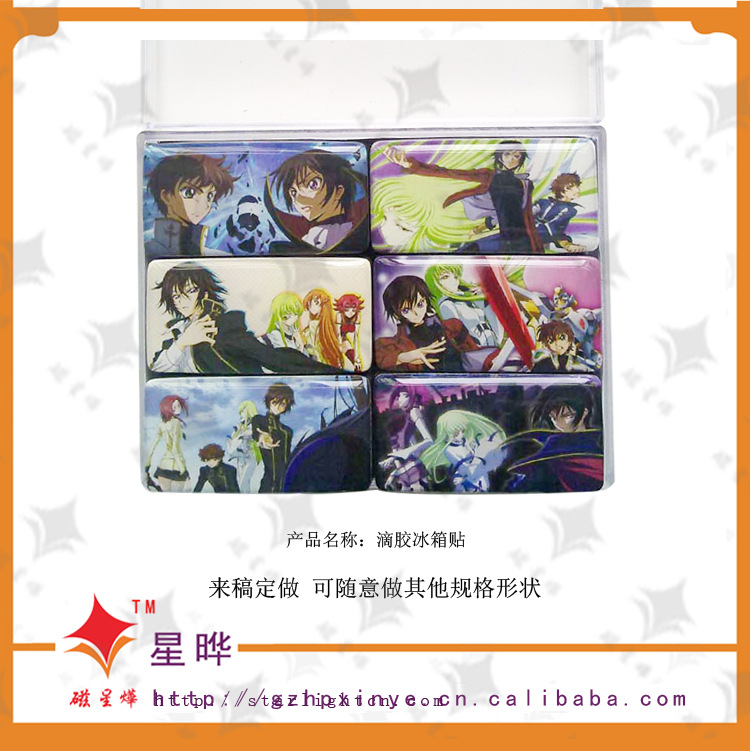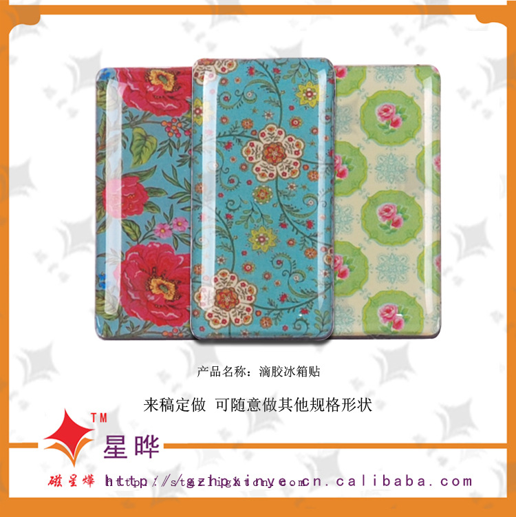12)滴胶冰箱贴:采用下面软胶磁铁+上面铜版纸彩色印刷+滴胶腹膜制作而成