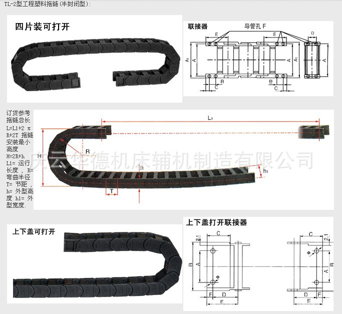 相同系列的拖链的内高、外高、节距相同,拖链内宽、弯曲半径R可有不同的选择。单元链节由左右链板和上下盖板组成,拖链每节都能打开,装拆方便,不必穿线,打开盖板后即可把电缆、油管、气管、水管等放入拖链。另可提供分隔片,将链内空间按需要分隔开。