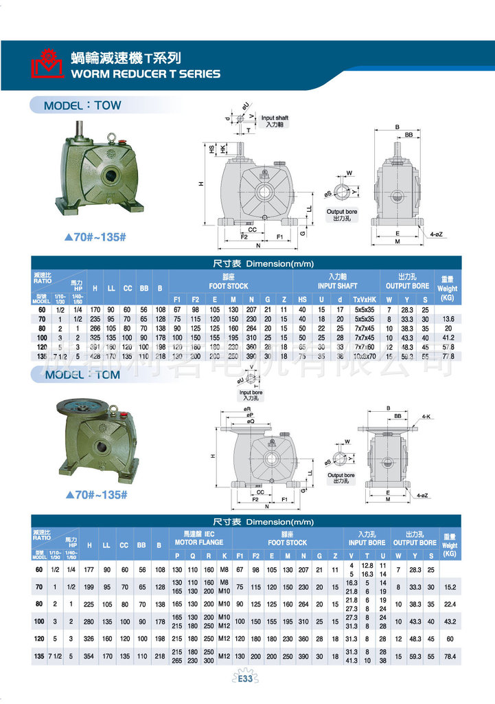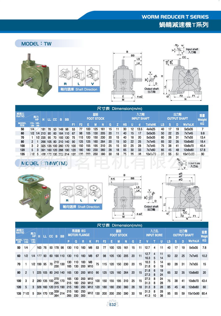 機型: 依外型傳動方式不同而區分,一 般而言機型代號內: 有M者為→馬達直結式機種 有O者為→出力軸中空機種 有H者為→二段式蝸輪減速機(蝸 輪-蝸輪) 有G者為→二段式蝸輪減速機(齒 輪-蝸輪) 型號: 由入力軸中心至出力軸中心距離 定出,型號愈大體積愈大。 馬力: 1/8HP~50HP | | 減速比: 單段蝸輪減速機 一般速比: 1/10 1/15 1/20 1/30 1/40 1/50 1/60 特殊速比:1/5 1/25 1/70 1/80 雙段式蝸輪減速機 蝸輪-蝸輪:1/100… 1/3600 齒輪-蝸輪:1/60… 1/360 軸向: L: 左軸(入力軸面對自己,出力軸在左方) R: 右軸(入力軸面對自己,出力軸在右方) V: 單入力軸雙出力軸 W: 雙入力軸單出力軸 F: 雙入力軸和雙出力軸 S: 特殊軸 (訂貨時請註明或附圖面) 旋向:設計上蝸桿使用右旋牙,故入力軸 以順時針方向旋轉時,出力軸以逆時針方 向旋轉,如需特殊旋向時請註明。 |