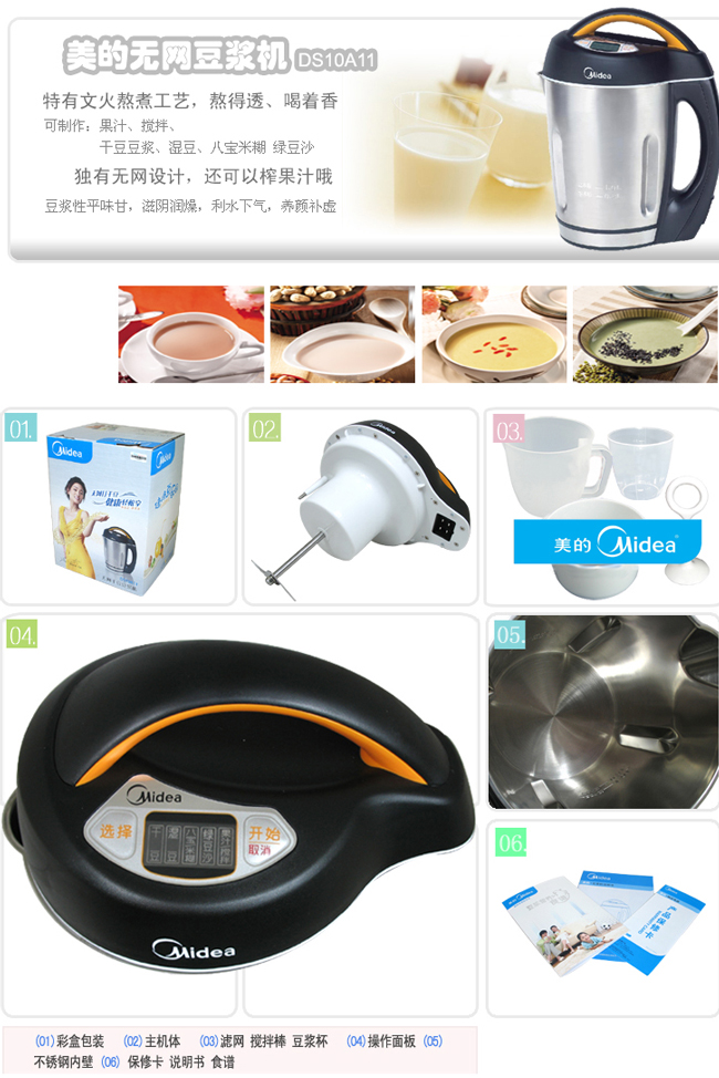 美的多功能无网豆浆机DS10A11(带搅拌水果功能)美的无网豆浆机DS10A11产品特点1、时尚数码管设计,高档突显科技感;