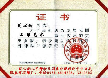七,god only help those who help themselves.我们的石雕在国内外享有“石破天惊,巧夺天工”之盛誉,文化部副部长潘震宙为公司题词:“古有麒麟卧龙藏,石生汉化蕴灵光;武氏祠内镌史记,曾子故里乃儒乡;石破天惊在嘉祥,巧夺天工美名扬。”我们为开封制做的“宋都御街石雕” 曾被温总理誉为——“中华石雕之最”。有"中华石雕大王"称号,其作品被选入全国首届民间 工艺美术作品及名艺人作品展。现在国家财政部门前的石狮子就是由我们精心雕刻的。祁佑我们祖国国富民强!