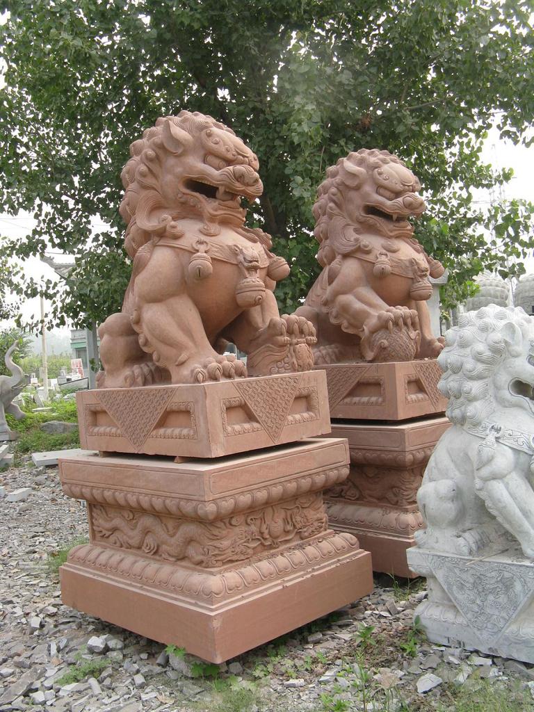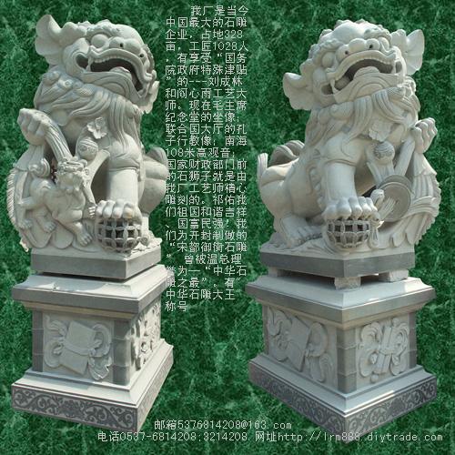 图中显示的是我们为08北京奥运村精心雕刻的霞玉石狮子。(按每一届奥运会对应设计雕刻一种造型。)广交会会馆门前的石狮子;香港亿万富翁(金利来董事局主席)曾宪梓博士门前的曾氏公馆门狮;2007年在沈阳召开的“世界园艺博览会”4个大门口的石狮子;还有现在国家财政部门前和国家税务总局门前的石狮子就是由我们精心雕刻的。祁佑我们祖国国富民强!中国最早的石雕狮子在我们嘉祥------“武氏墓群石刻”。这是国务院公布的全国第一批重点文物保护单位。被联合国定为世界文化遗产。