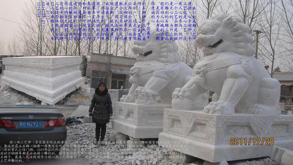 四,阎心雨工艺师(享受国务院津贴)。像祁佑我们祖国国富民强的国家财政部门狮和国家税务总局门前的石狮;奥运村霞玉石狮(按每一届奥运会对应设计雕刻一种造型。);广交会会馆门前的石狮;香港亿万富翁曾宪梓博士门前的曾氏公馆门狮;2007年在沈阳召开的“世界园艺博览会”4个大门口的石狮子;中国电信门狮。还有太和殿大修后的仿铜狮等都是由他精心雕刻的。图中显示的是我厂阎氏工艺师雕刻的:现在中华人们共和国最高人民法院门前的石狮子,最高人民法院领导为阎心雨工艺师题写了“狮王”书法条幅。另外现在最高人民检察院门前的门狮也是阎氏工艺师雕刻的。