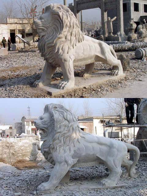 然后进入雕刻阶段:先打狮座子。打好底座后,用吊车或者滑轮将石方吊起倒置过来,使狮座朝下,进行头部雕刻,从嘴巴,唇形到位后才细雕牙齿,鼻子……头部结束后,进而雕刻身子。看过石狮的人都知道,任何一只石狮,通过两只前脚之间是可以望见石狮肚子的,用行家的话来说叫″前脚显肚″。这是十分考究的工艺环节,雕刻者在雕刻前脚时必须十分巧妙而又精准地把握好高度,保证″前脚显肚″。