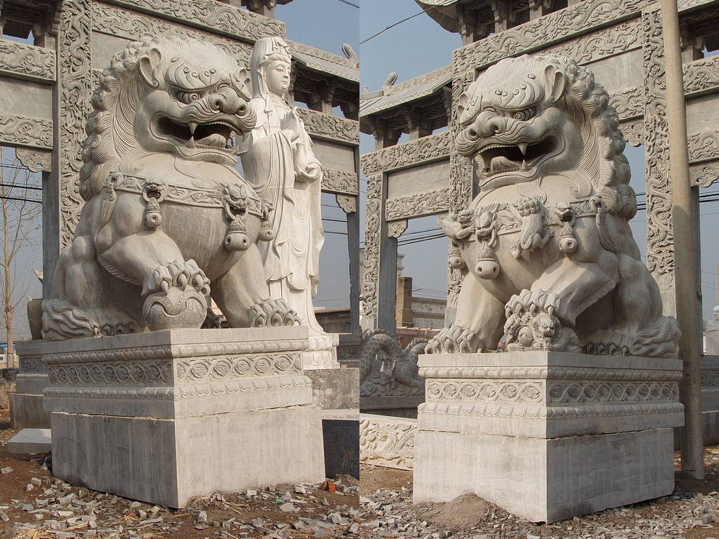此后,狮子逐渐演变成老百姓心目中的灵兽。石狮是用石头雕刻而成,是中国传统建筑中经常使用的一种装饰物。大者置在宫殿、寺庙、桥端、府邸、园林、陵墓等处,小者可作室内、案几装饰。因威武之气浓郁,还常被咱老百姓用作镇邪,总之是为人服务的,颇得人类喜欢,故虽是泊来之物,但却很快博得百姓喜爱,并悄无声息地挤进中国图腾文化之列,以至于现在很多年轻人都不知道它原来是″外来物″。