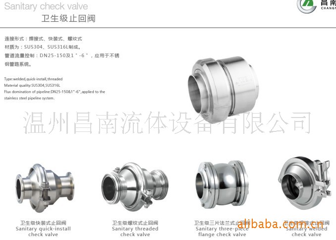 产品详细说明: 材质有:304—316L 此产品为快装卡箍式和焊接式;(别称:单向阀)