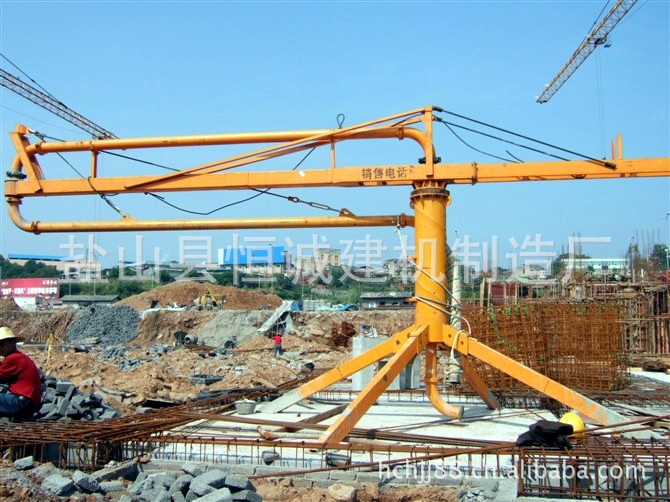 河北省盐山县恒诚建机制造厂【联系电话:15369808331 QQ:1139441259 网址;http://www.czhcjj.com 传真:0317-6390182】是生产各类国产进口混凝土拖式泵、泵车管道配件的专业厂家 主要产品:混凝土双轴承手动布料机、布料杆:BLG-12米、15米、18米系列产品。其特点造型美观,布料范围广,结构合理,上主梁采用拼装式结构,便 于运输及工地转移,中间回转采用标准滚动回转支撑,弯管半径设计合理,泵送阻力小,支撑节高度,可根据用户需要增减,底角配有四条支腿,。本产品在原来三 角臂,四角臂布料机前提下,更改为现在双槽钢对焊结构产品,产品更为安全、可靠、实用。本机械手动操作轻便灵活,全回转360度,能将混凝土快速准确的送 低施工作业面的任一浇拄部位,并连续浇注。极大地解决了混凝土水平面布料问题。混凝土布料机、布料杆与混凝土泵有效地连接配套,使两种机械性能得到了最大 发挥真正提高了混凝土浇注质量,达到了机械化水平。