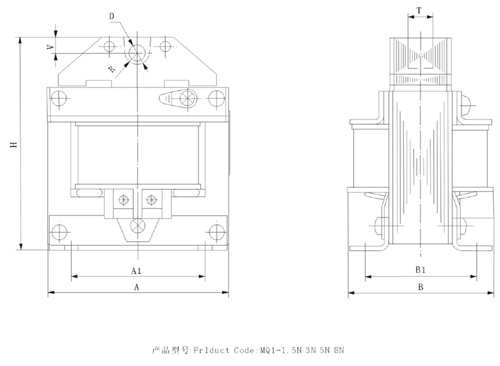 型号 | 外形尺寸 | 安装尺寸 | 安装孔 | 有关尺寸 | 衔铁重量 g | A | B | H | A1 | B1 | a | B | D | R | V | T | MQ1-0.7N | 51.5 | 51 | 66 | 40 | 36 | 8 | 6 | φ4 | 4 | | 2 | 108 | MQ1-1.5N | 70 | 80 | 85 | 55 | 39.5 | 8 | 6 | φ5 | 5 | 5 | 9 | 250 | MQ1-3N | 83 | 85 | 96 | 60 | 47.5 | 8 | 6 | φ7 | 7 | 7 | 10 | 450 | MQ1-5N | 110 | 100 | 120 | 83 | 59 | 10 | 7 | φ8.5 | 10.5 | 9 | 12 | 875 | MQ1-8N | 110 | 100 | 120 | 83 | 72 | 10 | 7 | φ8.5 | 10.5 | 9 | 18 | 1230 |
