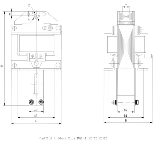 型号 | 外形尺寸 | 安装尺寸 | 安装孔 | 有关尺寸 | 衔铁重量 g | A | B | H | A1 | B1 | a | B | D | R | V | T | MQ1-15N | 142 | 113 | 198 | 108 | 85 | 12 | 12 | φ13.5 | 14 | 10 | 12 | 2600 | MQ1-25N | 142 | 148 | 198 | 108 | 120 | 9 | 9 | φ13.5 | 14 | 10 | 20 | 4500 |