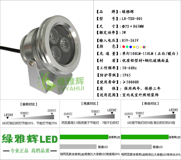 1、LED投射灯采用高亮度进口芯片,亮度高,低能耗,低热量,寿命长达到 50000H,可分为单色,七彩变色两种。 2、外壳采用高级氧化喷涂铝型材和整体模压加工工艺,钢化玻璃面盖,确保了良好的散热效果,有效的减少了LED使用过程中的光衰。 3、采光光学级PMMA高效透镜,光损小、照度好。 4、采用滚边等新工艺,确保外壳整体性好,密封可靠,防水防尘达IP65。 5、使用电压12V、24V、85V-265V可选。 6、投射距离达10-20米以上,特别适合景观建筑物楼体,户外广场,墙面、陈列品刷色 。 7、具有良好的电磁兼容性,不会对周边环境造成电磁干扰。 8、使用低压电源,安全可靠,耗电少,使用寿命长结实耐用,安装操作程序简单。 9、广泛应用于单体建筑、历史建筑群外墙照明、大楼内光外透照明、室内局部照明、绿化景观照明、广告牌照明、医疗文化等专门设施照明、酒吧、舞厅等娱乐场所气氛照明等。 |