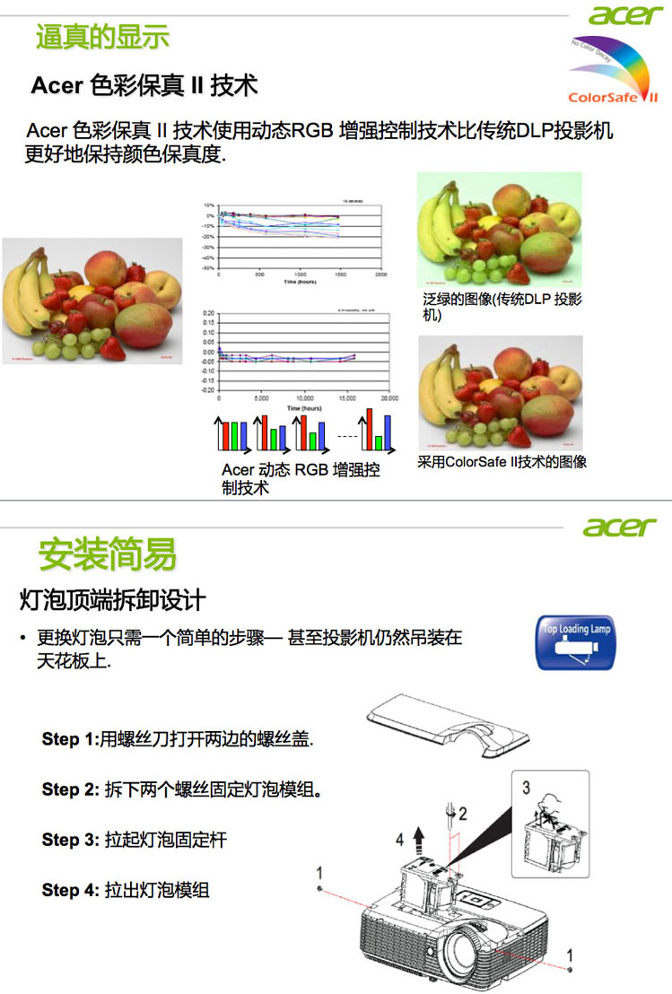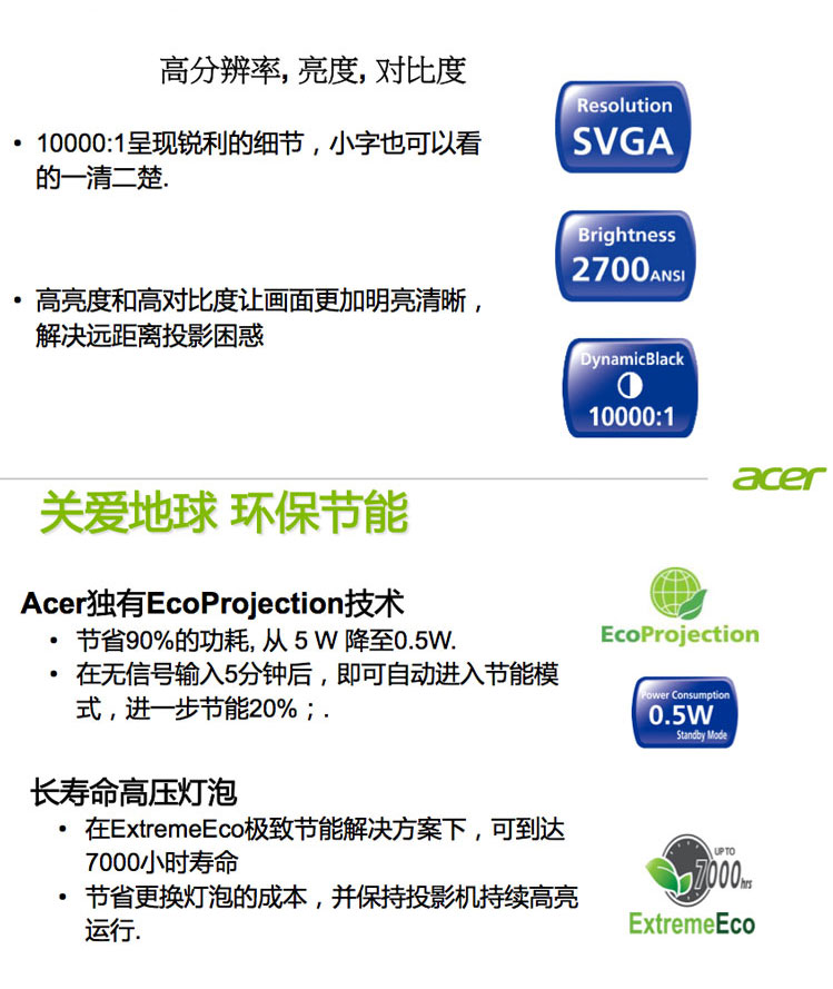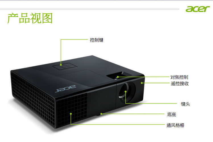 | 设置简单、功能先进,易操作。 演示灵活,绿色环保 | | | 1.DLP 3D Ready 须刷新率120 Hz以上,即可呈现3D效果 2.Acer 第三代跃彩技术 通过调整灯泡功率来调整颜色强弱,解决某些图片本身颜色上的差异,起到对图片润色的作用,使显现出来的图片显得更加逼真鲜艳 3.Acer 第二代色彩保真技术 避免色彩衰减,并保证长时间使用后的色彩依然真实亮丽,体现DLP技术优势 4.Acer 灯泡顶端拆卸技术 无需拆卸吊装投影机,即可通过简单几步换灯泡 5.超高对比度 10000:1的超高对比度让黑白文档表现更加卓越,视频无拖尾 6.超长灯泡寿命 7000小时的灯泡寿命,意味着减少更换灯泡的频率,从而降低总维护成本。 | | | |
