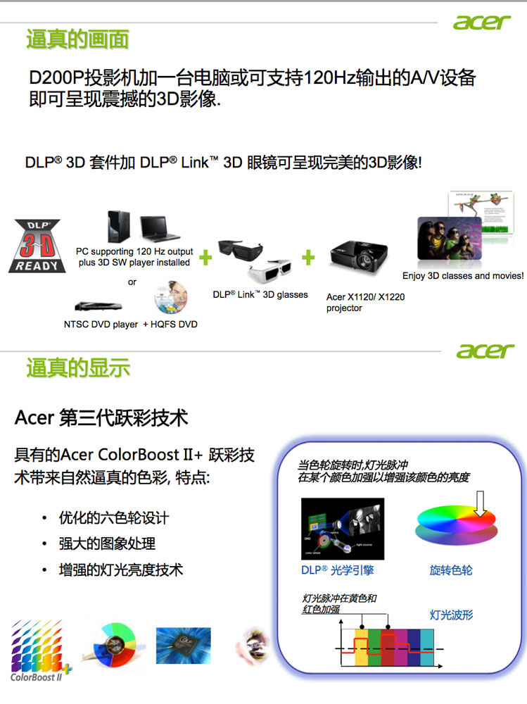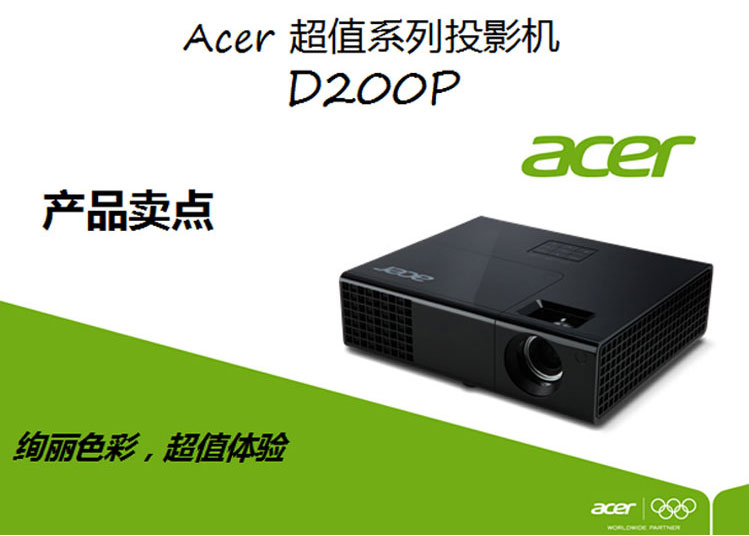 | 色彩艳丽,超值体验 | | | | Acer D200P投影机2700流明,适合中小型企业及教室使用,画面清晰,安装简单专业电源解决方案,更加节能省电. 同时支持3D立体投影,带给我们更真实直观的立体画面效果. | | | | | |