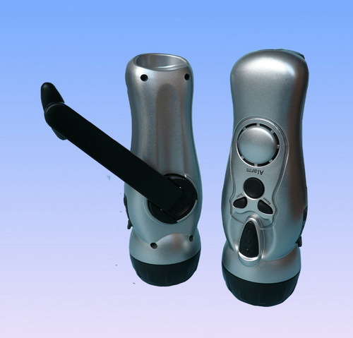 手电筒上具有报警声响、手摇式充电、收音机、高亮LED灯等。可以在家庭或野外时